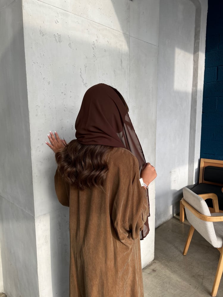 التفاصيل : قماش حرير مغسول، قصة نص بشت ،طرحة بني غامق.