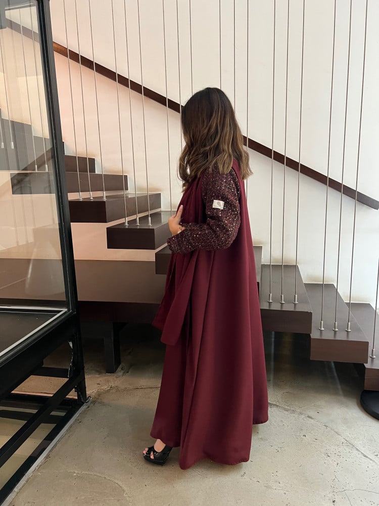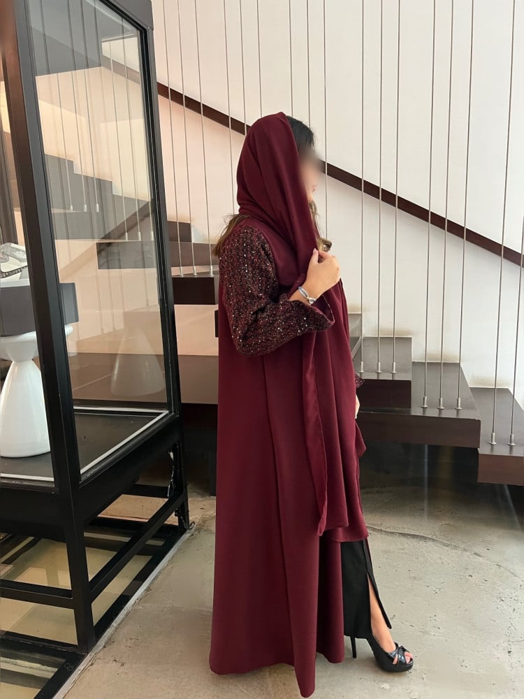 التفاصيل : قماش كريب سيراميك وشانيل ، قصة كلوش، طرحة عودي.
