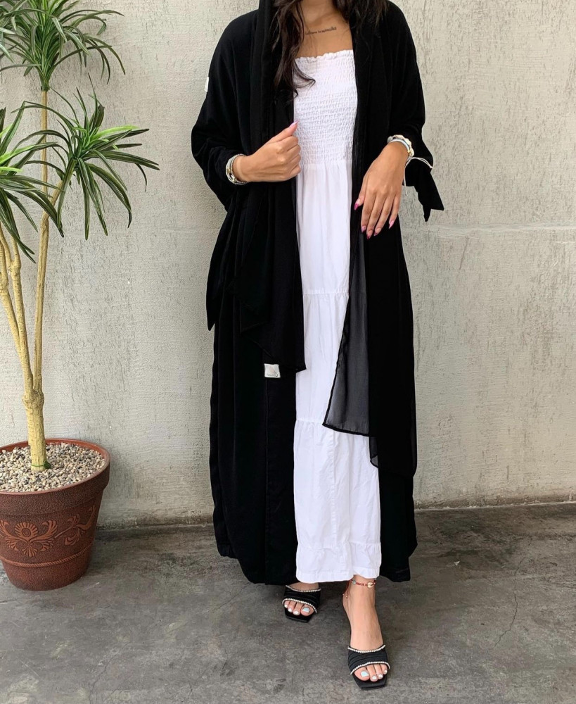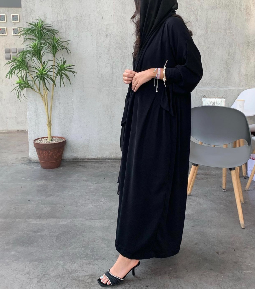 التفاصيل : قماش كريب ، قصة كسرات من الجنبين ، الاكمام ربط مع طرحة سادة سماوي .
