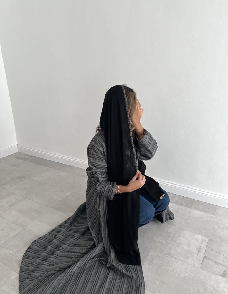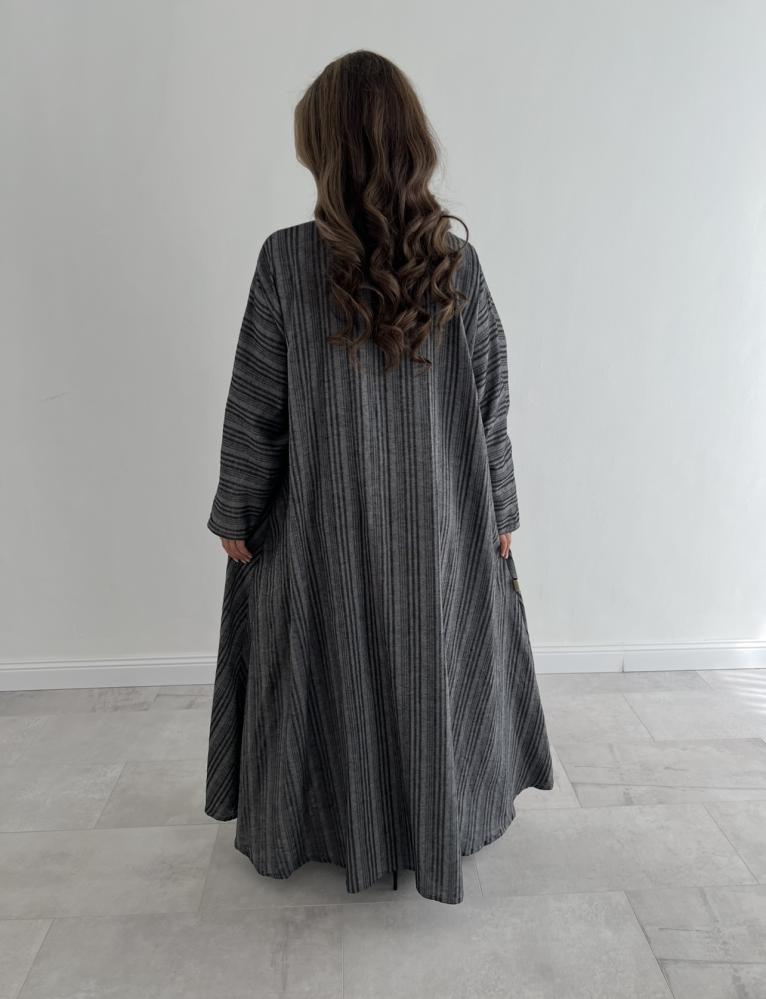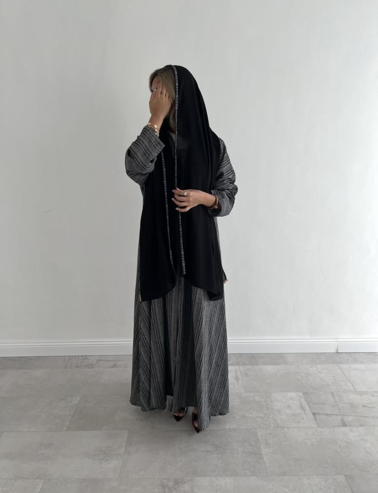 قماش لنن مخطط، قصة كلوش ،طرحة اسود .