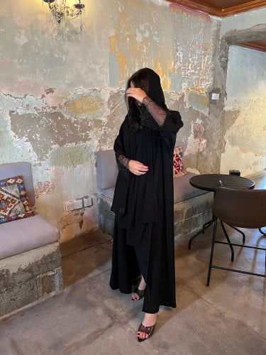 قماش جازار بروكار تركي وكريب ملكي، قصة كلوش، طرحة أسود سادة .