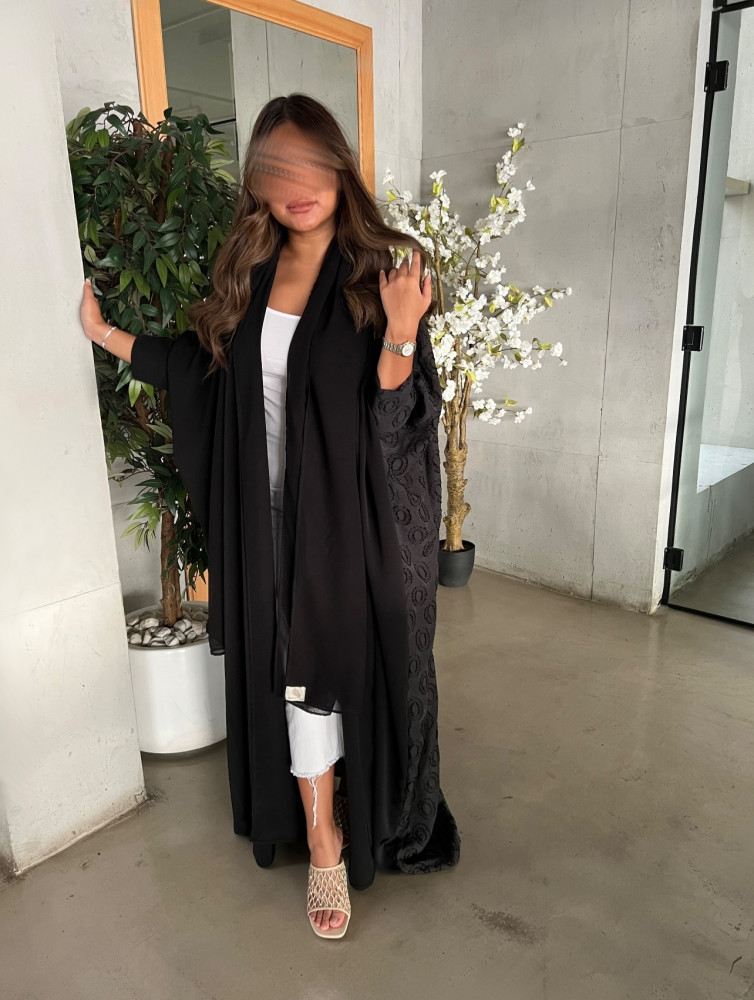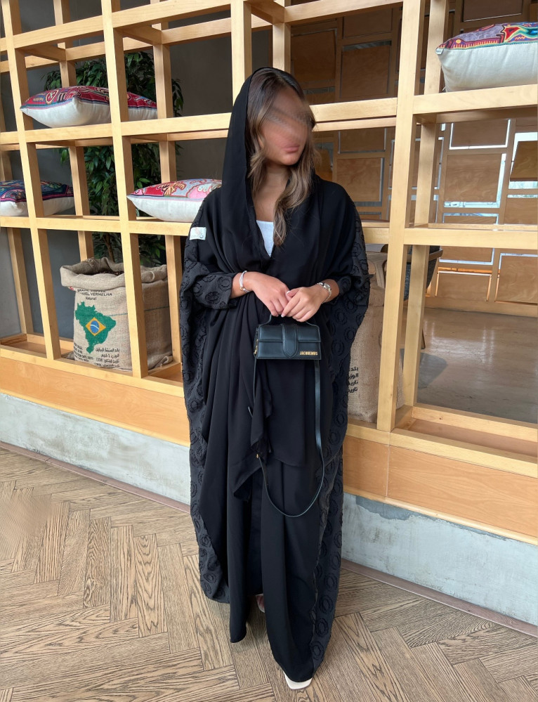 التفاصيل : قماش بلاك بيري وحرير مطرز، قصة بشت ، طرحة اسود .