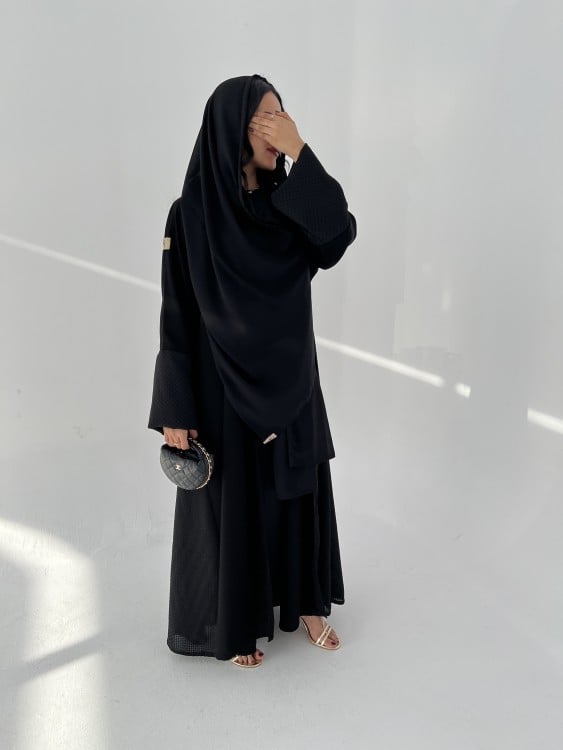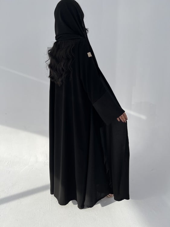 قماش كريب ملكي و بالاكمام وجوانب العباية ،قصة كلوش ، طرحة أسود .