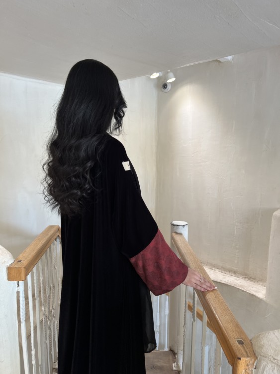 قماش مخمل قصة كلوش ، حرير مغسول احمر ، طرحة اسود .