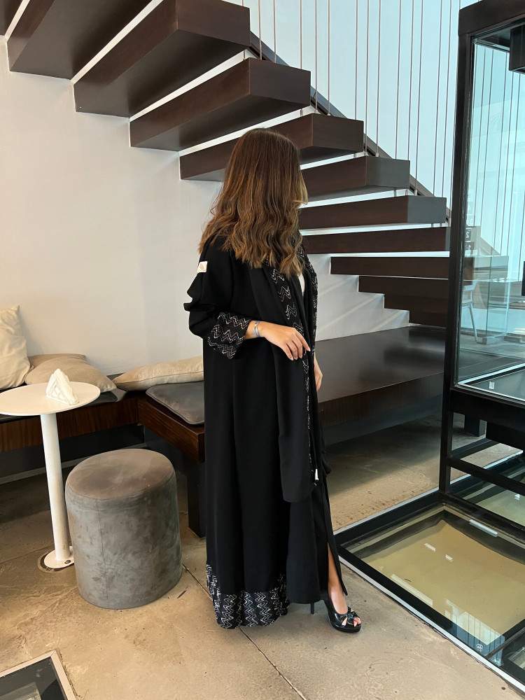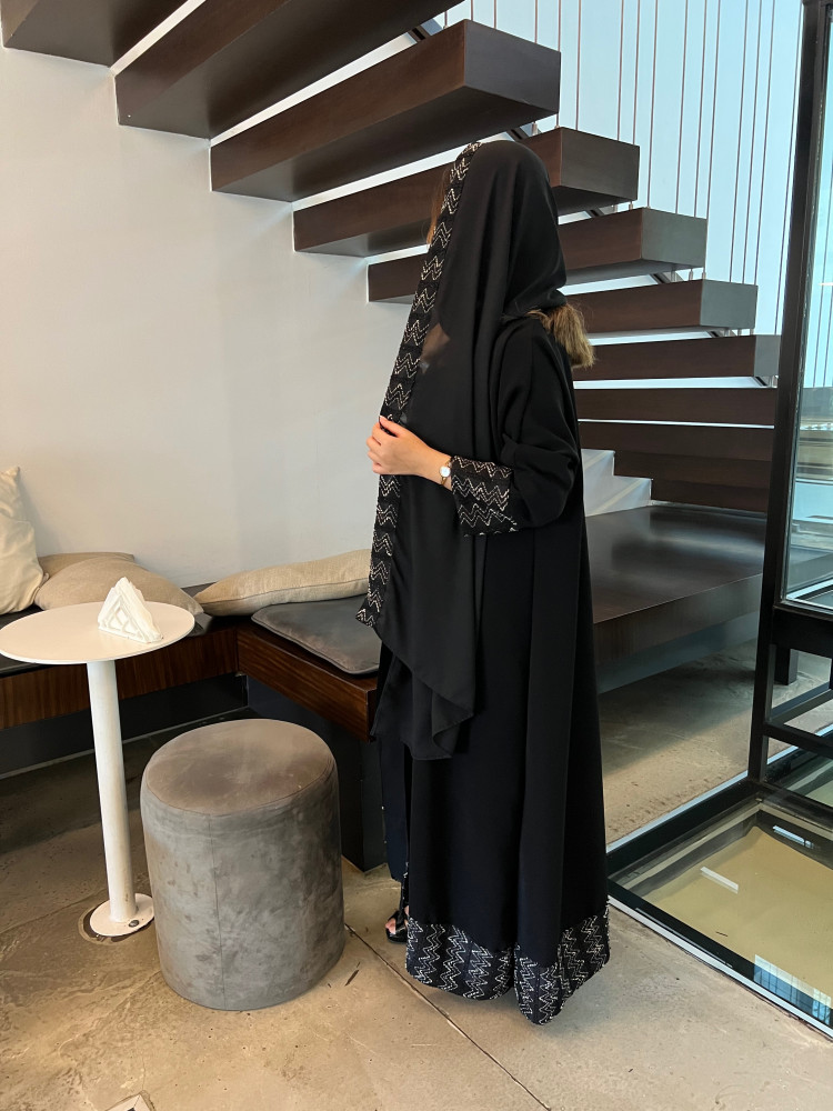 التفاصيل : قماش كريب سيراميك وشانيل ، قصة كلوش، طرحة أسود .