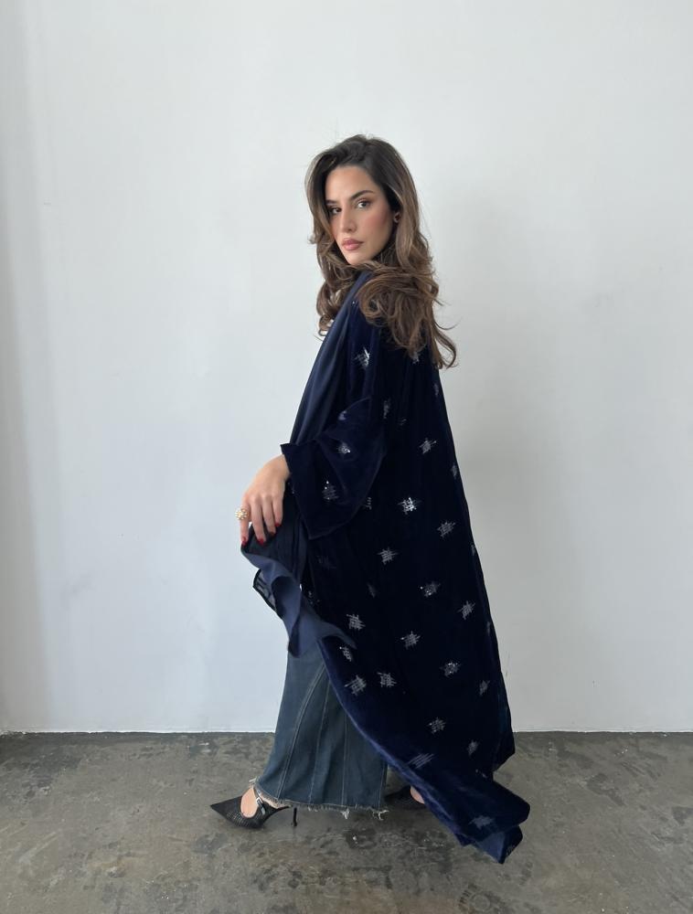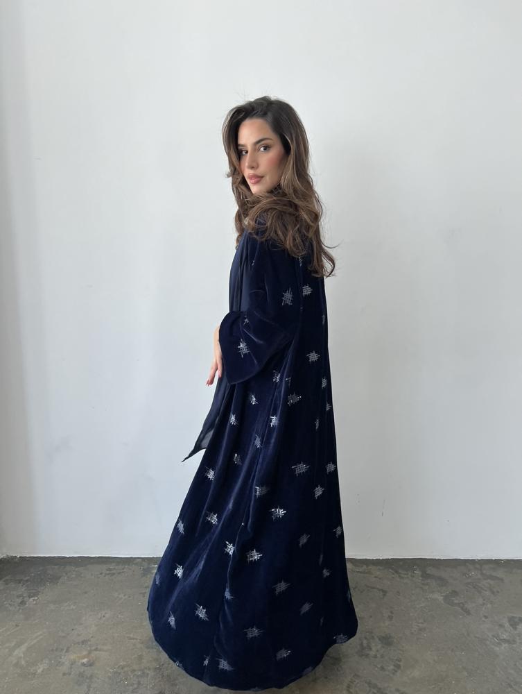 قماش مخمل مطرز هندي، قصة ربع كلوش، طرحة كحلي سادة .