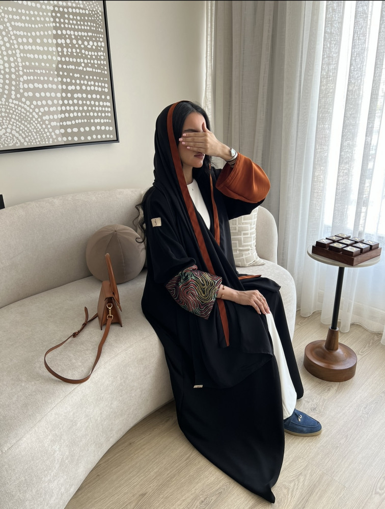 التفاصيل : قماش كريب ملكي مع اكمام مطرز بالكم اليمين واكمام كريب باللون البرتقالي بالكم اليسار ،قصة كلوش ،طرحة اسود