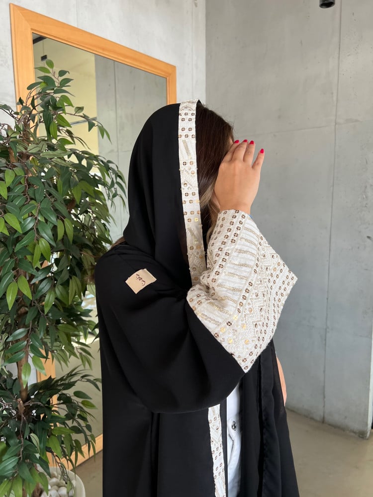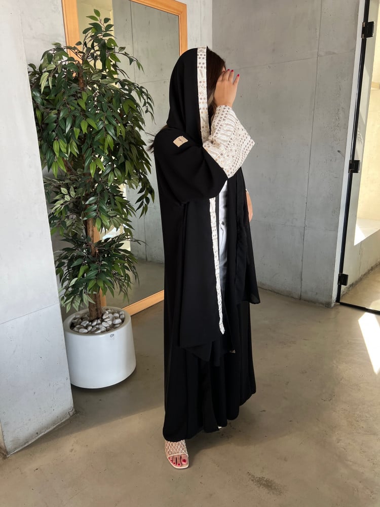التفاصيل : قماش كريب ملكي ومطرز ، قصة نص كلوش، طرحة أسود .
