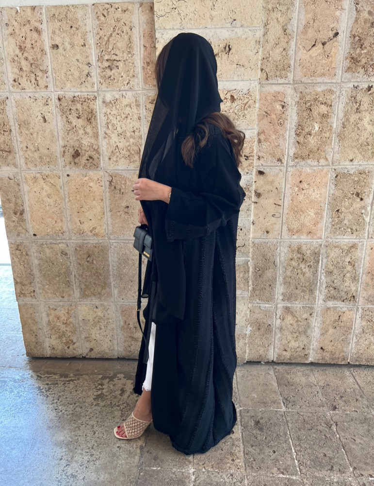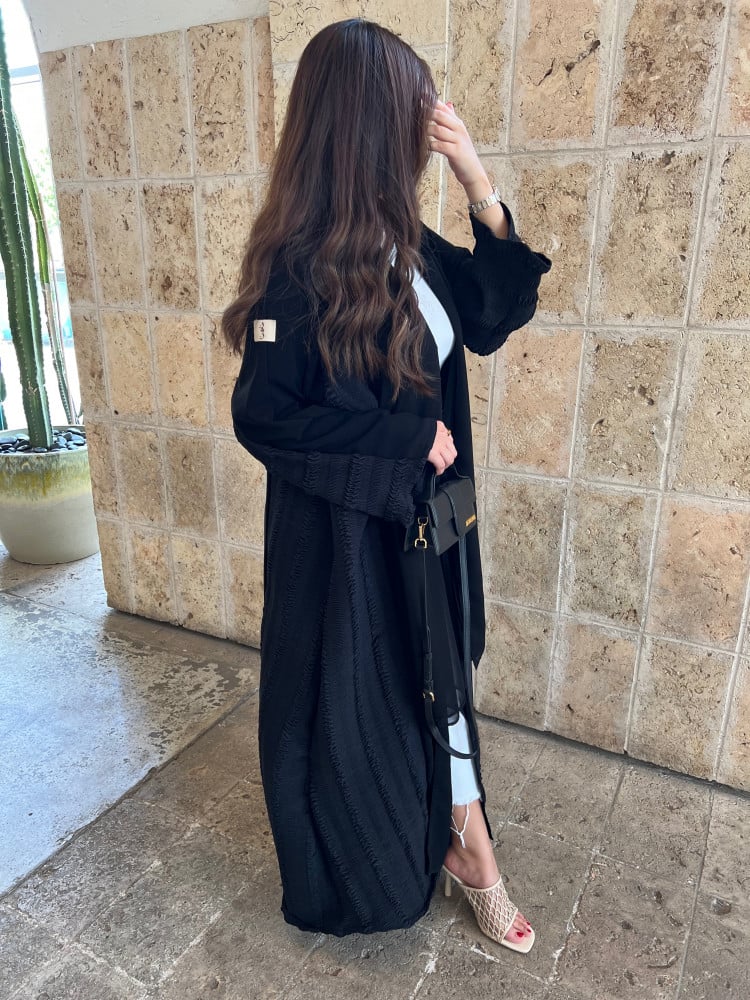 التفاصيل : قماش كريب ملكي مع بليسيه ايطالي مع الجنبين ،قصة كلوش ،طرحة أسود.