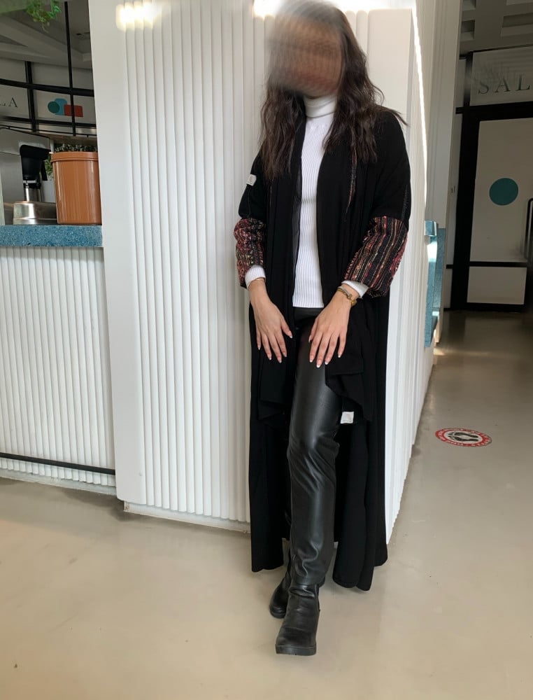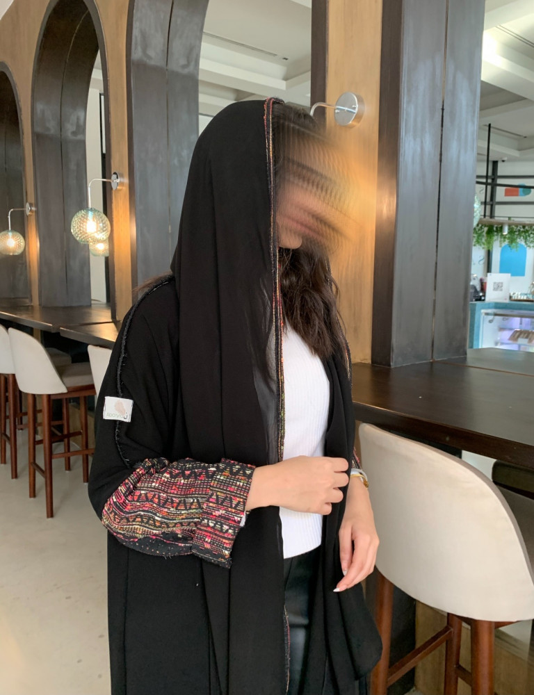التفاصيل : قماش كريب ملكي مع اكمام كتان مقلم، طرحة اسود .