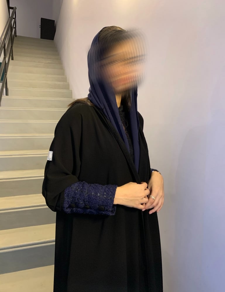 التفاصيل : قماش كريب ملكي مع اكمام شانيل كحلي ، طرحة كحلي سادة