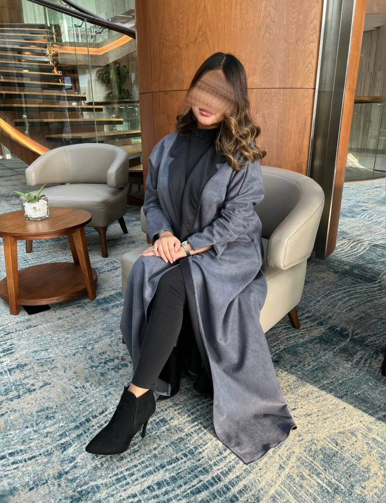 التفاصيل : قماش شاموه ، قصة نص كلوش، طرحة رمادي غامق سادة .