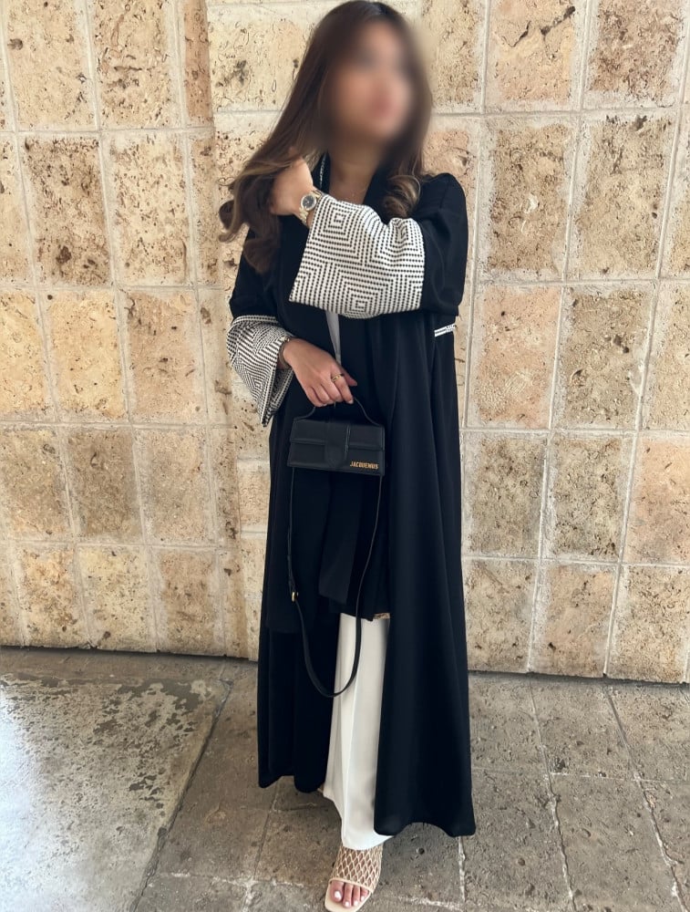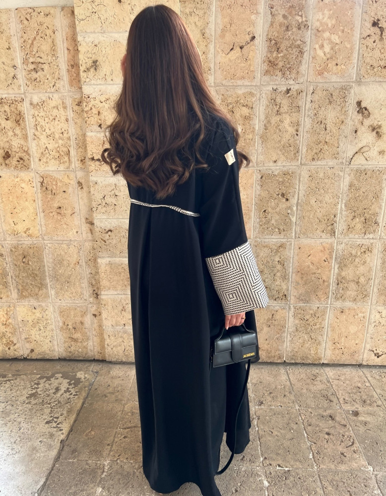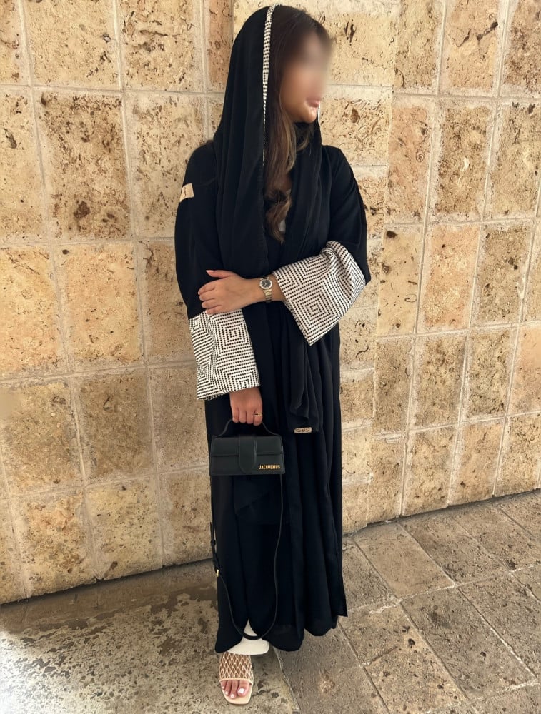 التفاصيل : قماش كريب و كتان مطرز ،قصة كلوش مع كسرة بالخلف وفتحات جانبية صغيرة ،طرحة أسود .