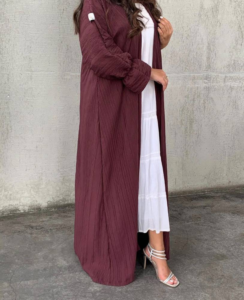 التفاصيل : قماش كريب بليسيه، قصة كلوش ، طرحة سادة موف .