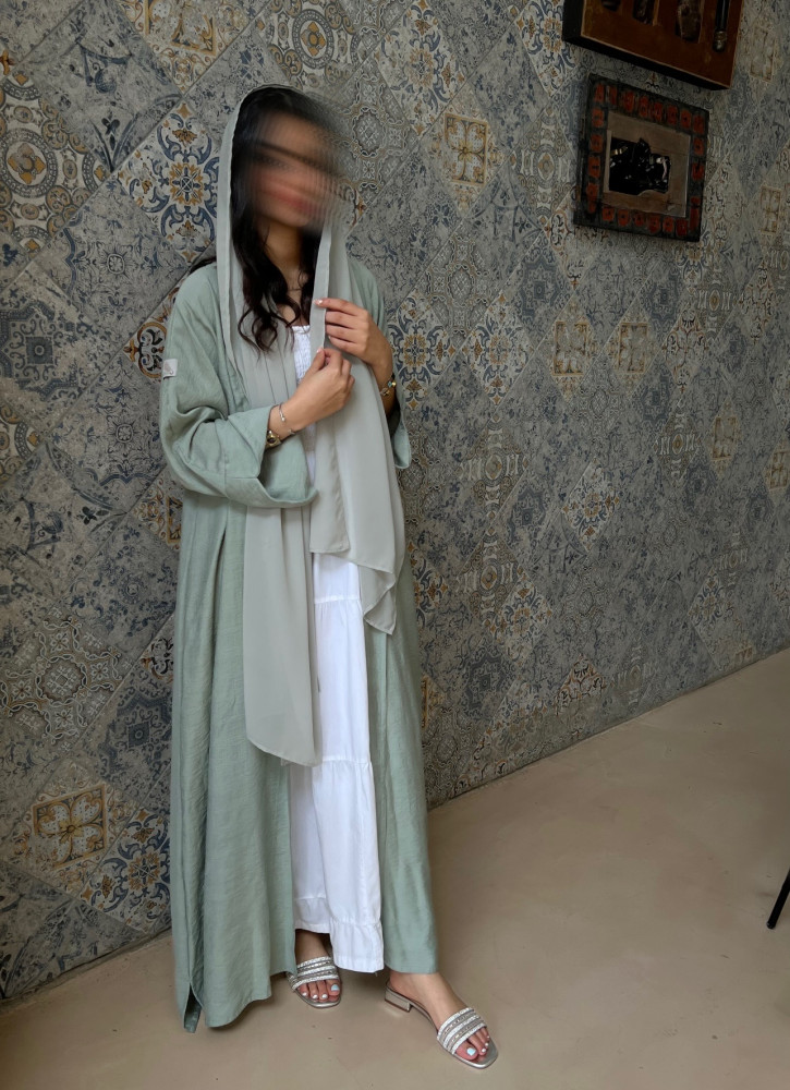 التفاصيل : قماش كتان تفاحي مع كسرة من الخلف وفتحات صغيرة مع الجنبين مع طرحة تفاحي سادة .