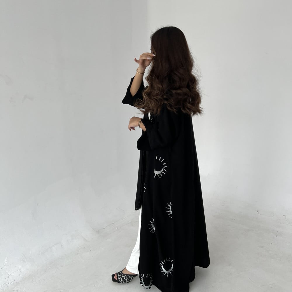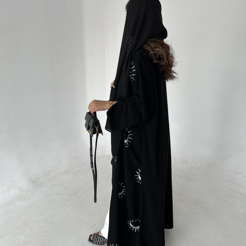 قماش كريب ملكي مطرز ،قصة كلوش ومن الخلف قماش كريب ملكي سادة ، طرحة أسود سادة.