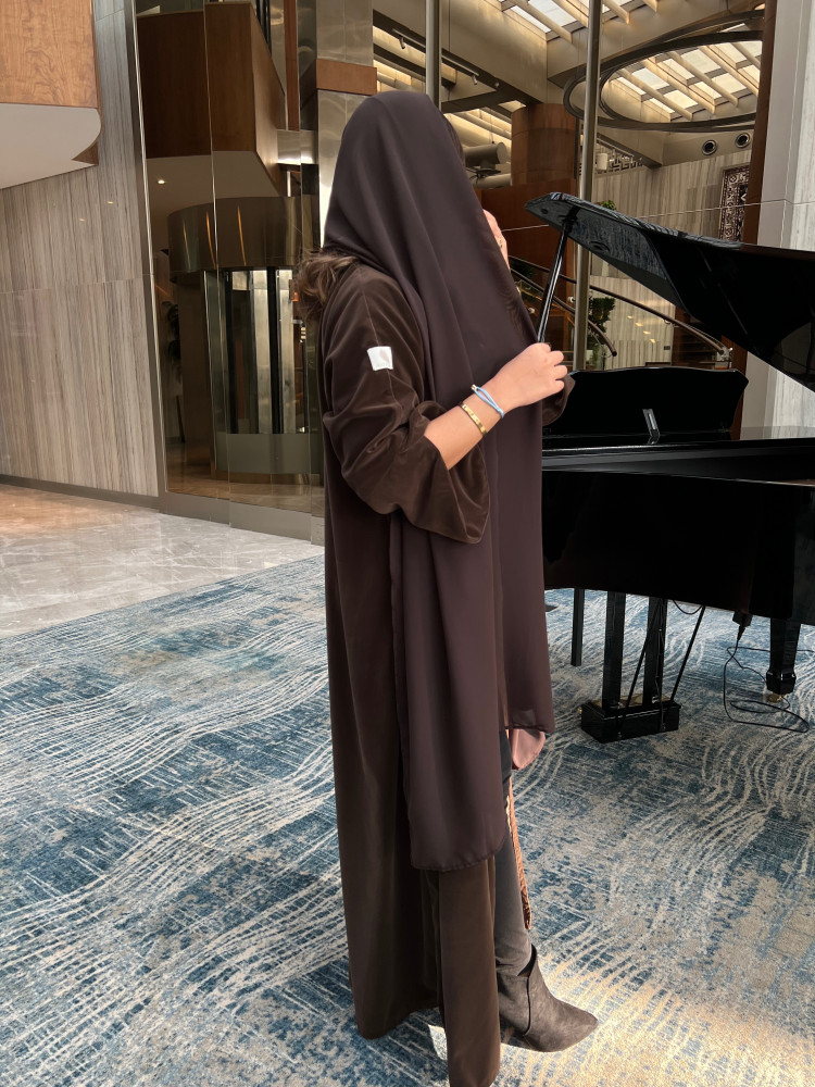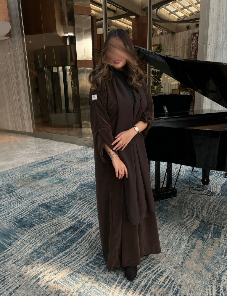التفاصيل : قماش مخمل ، قصة نص كلوش، طرحة بني سادة .