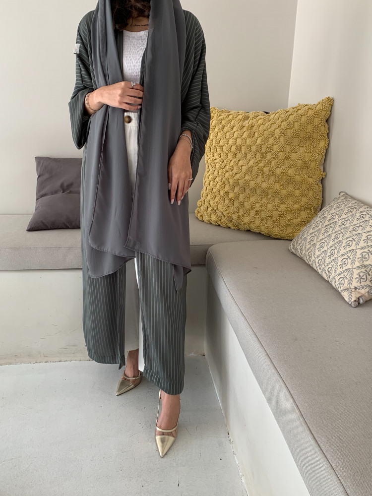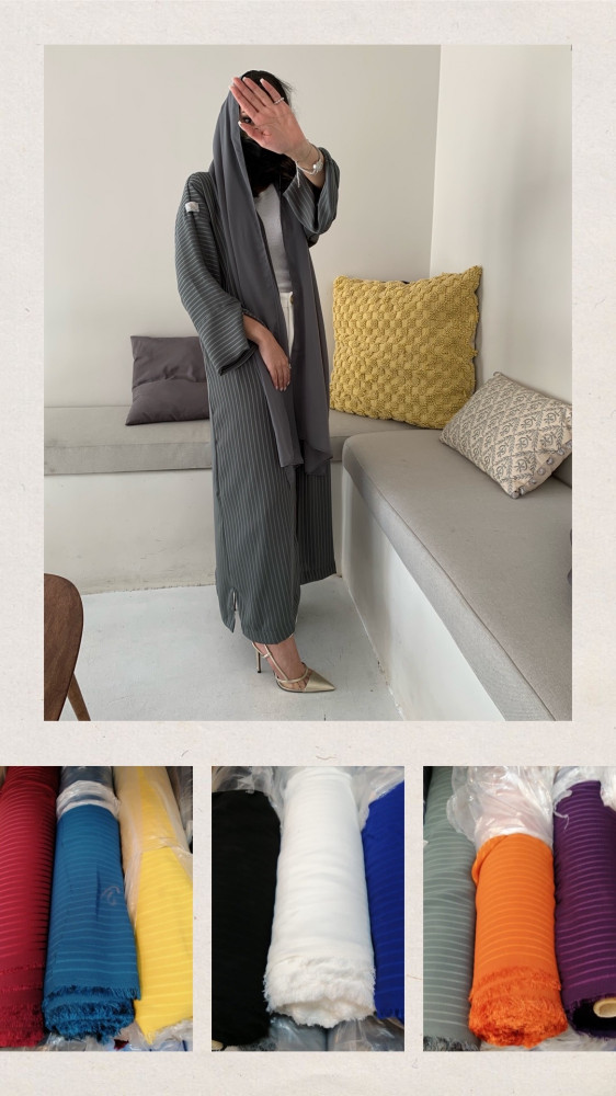 التفاصيل : قماش كريب مقلم ، قصة كسرة من الخلف مع فتحات من الجنبين اسفل العباية ، الاكمام مفتوحة مع طرحة سادة رمادي .