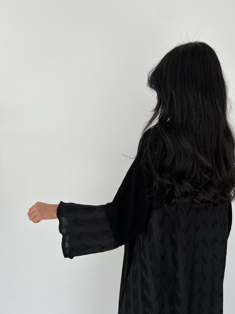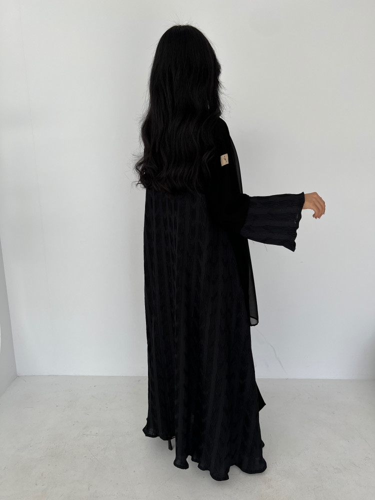 التفاصيل : قماش كريب ملكي مع تكسيره بالخلف والاكمام ،قصة كلوش ،طرحة اسود .