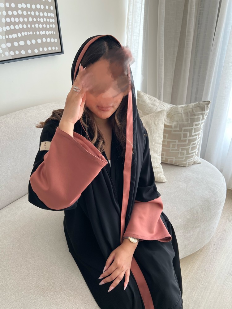 قماش كريب ملكي، اكمام شامواه مبطن ، قصة كلوش ، طرحة أسود سادة.