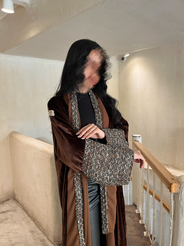 قماش مخمل وشانيل شتوي قصة كلوش ،طرحة بني .