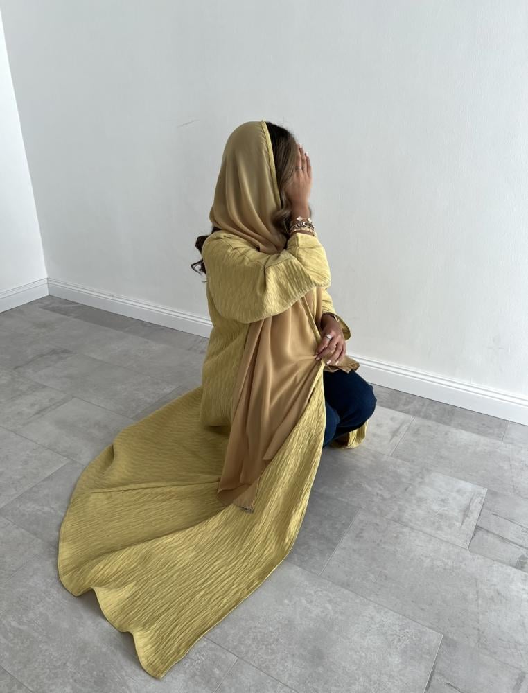 قماش كتان مكسر،قصة كلوش ، طرحة اصفر.