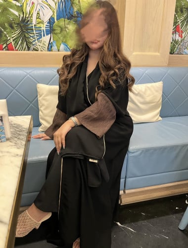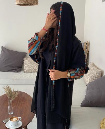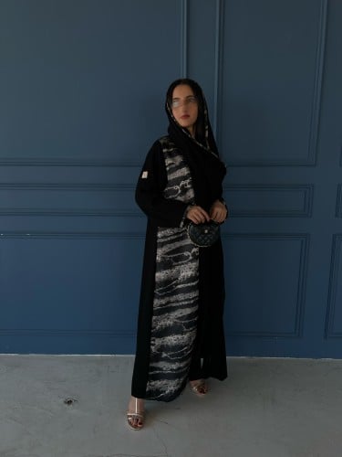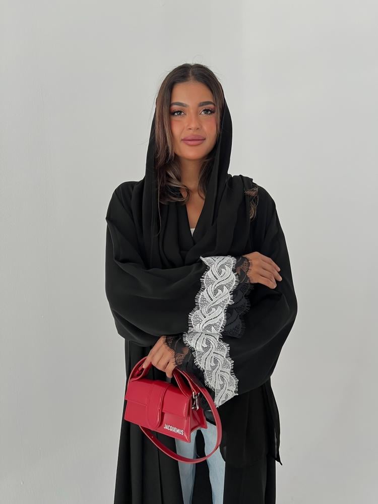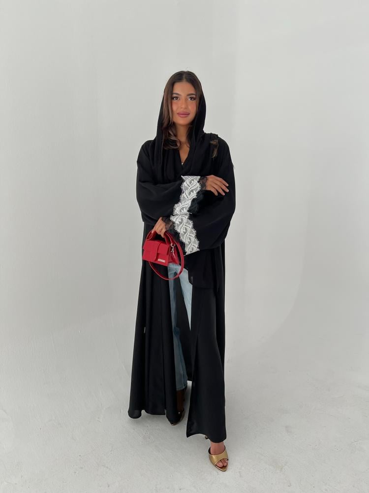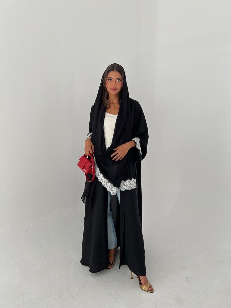قماش كريب ناعم ، قصة كلوش ، طرحة اسود بطرف دانتيل.