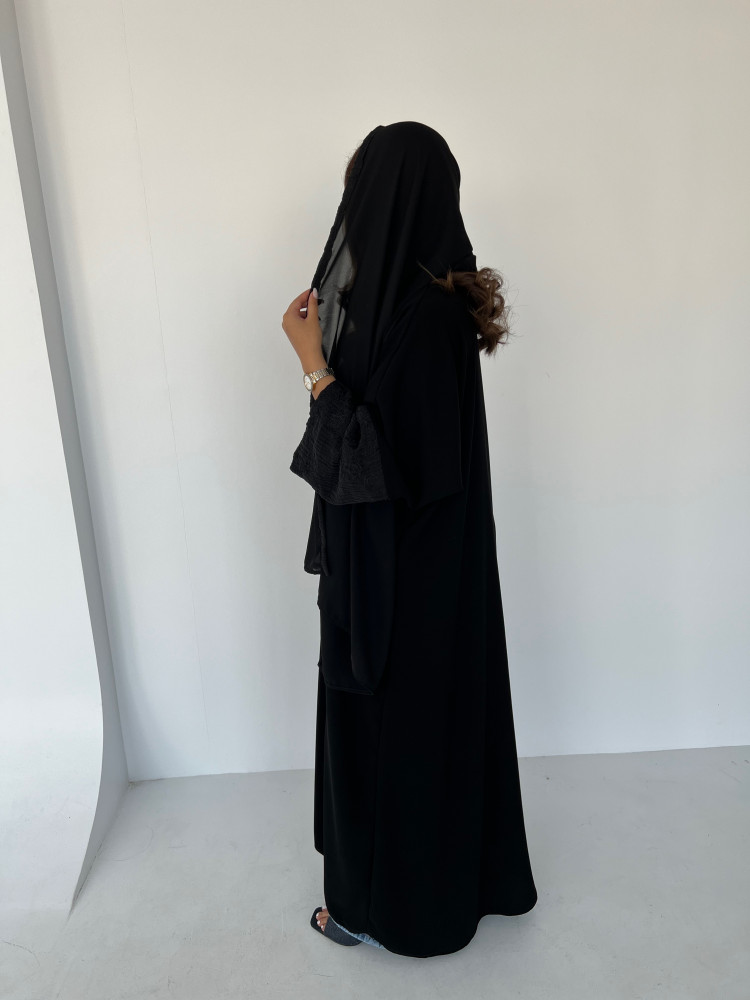 التفاصيل : قماش كريب ملكي ولنن ،قصة نص بشت ، طرحة أسود .