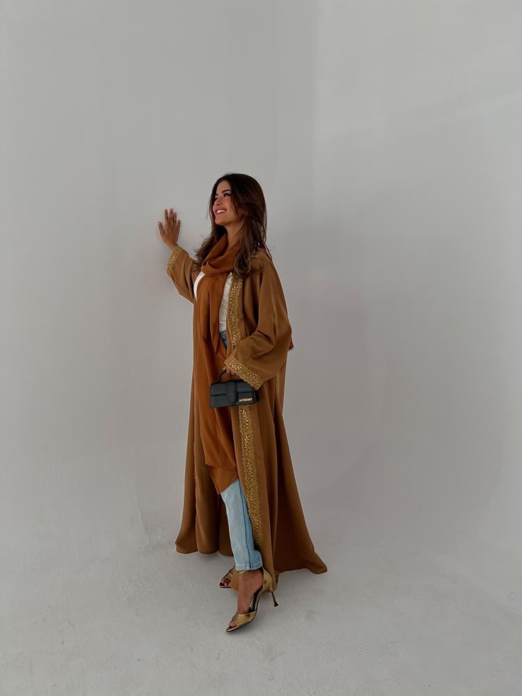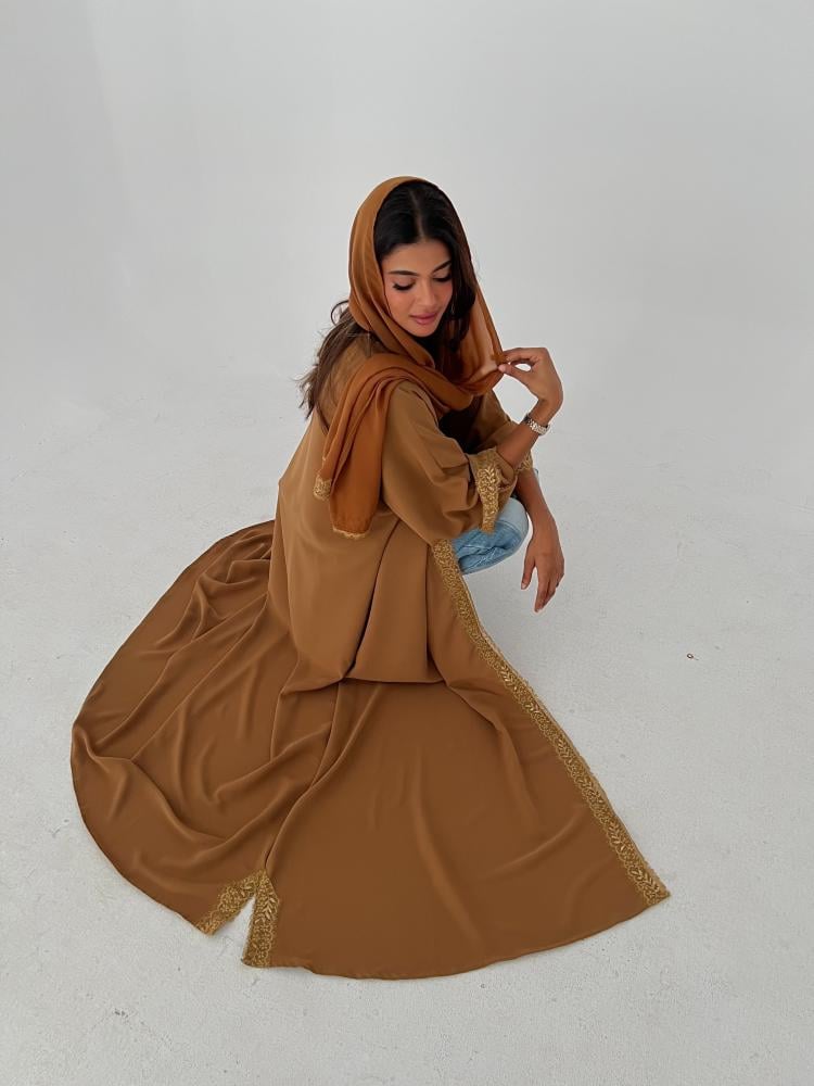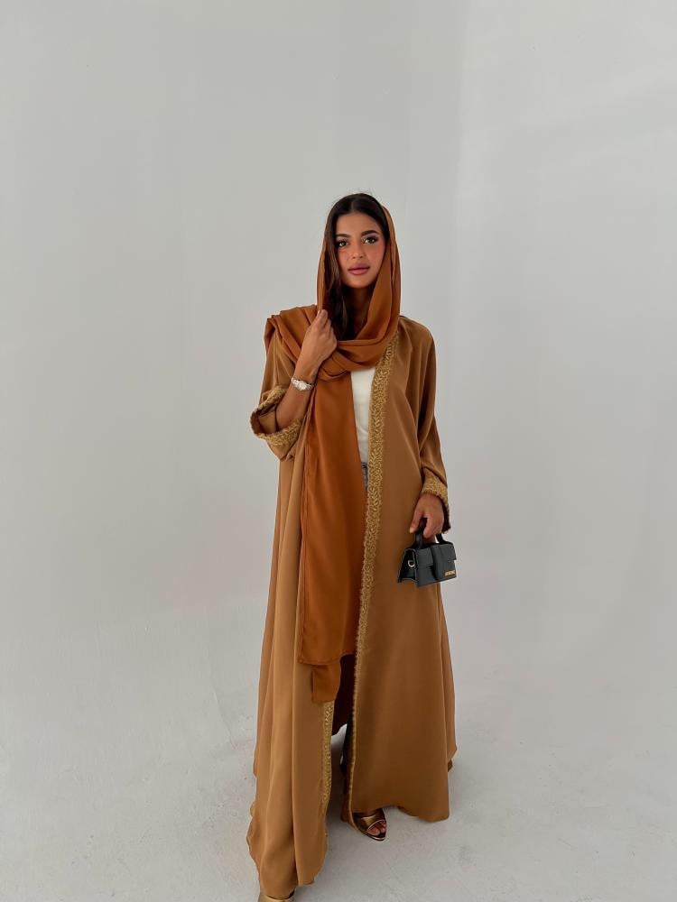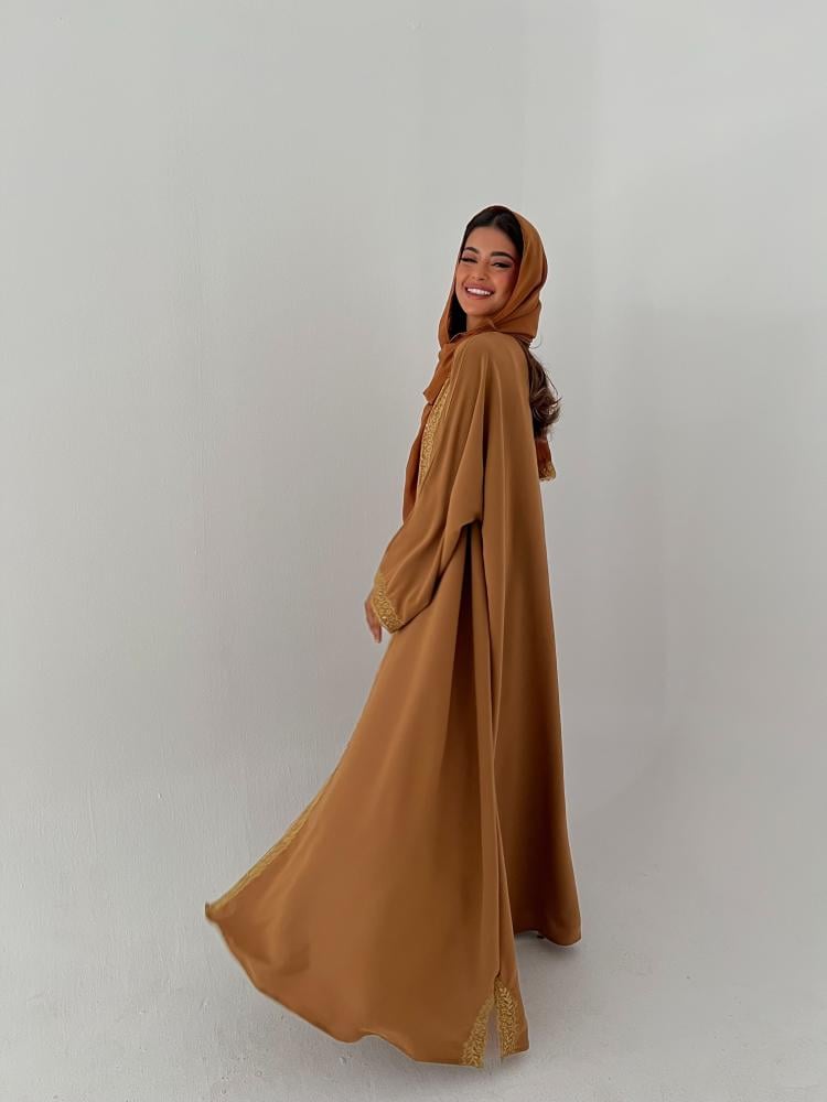 قماش كريب ناعم ، قصة كلوش ، طرحة بطرف دانتيل .